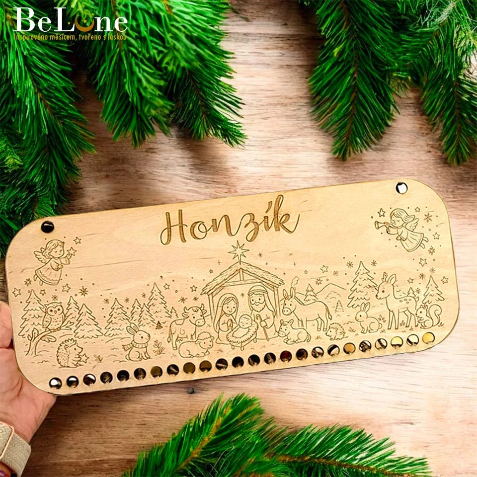 Vytvořte doma pravé vánoční kouzlo s naším dřevěným adventním kalendářem s betlémem. Každý detail je precizně vygravírován do kvalitního dřeva – od andílků až po zvířátka, která obklopují Svatou rodinu.