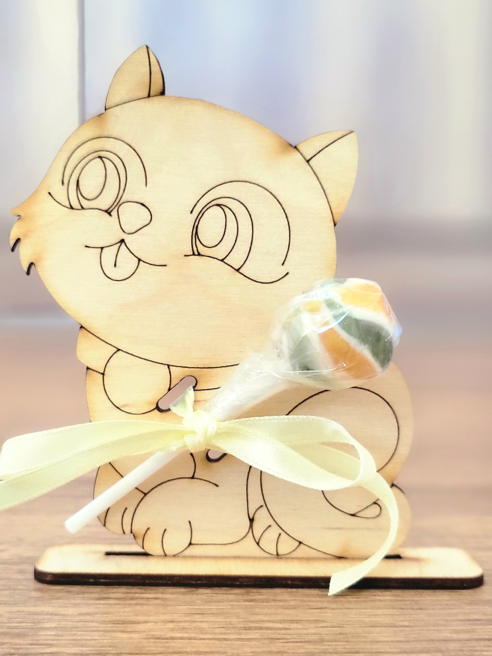 Dřevěná kočka na lízátko nebo jinou drobnost pro kamarády ve školce nebo kohokoliv jiného.
