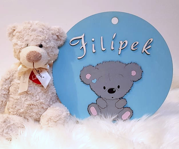 Medvídek se jménem v kruhu o průměru 30 cm.