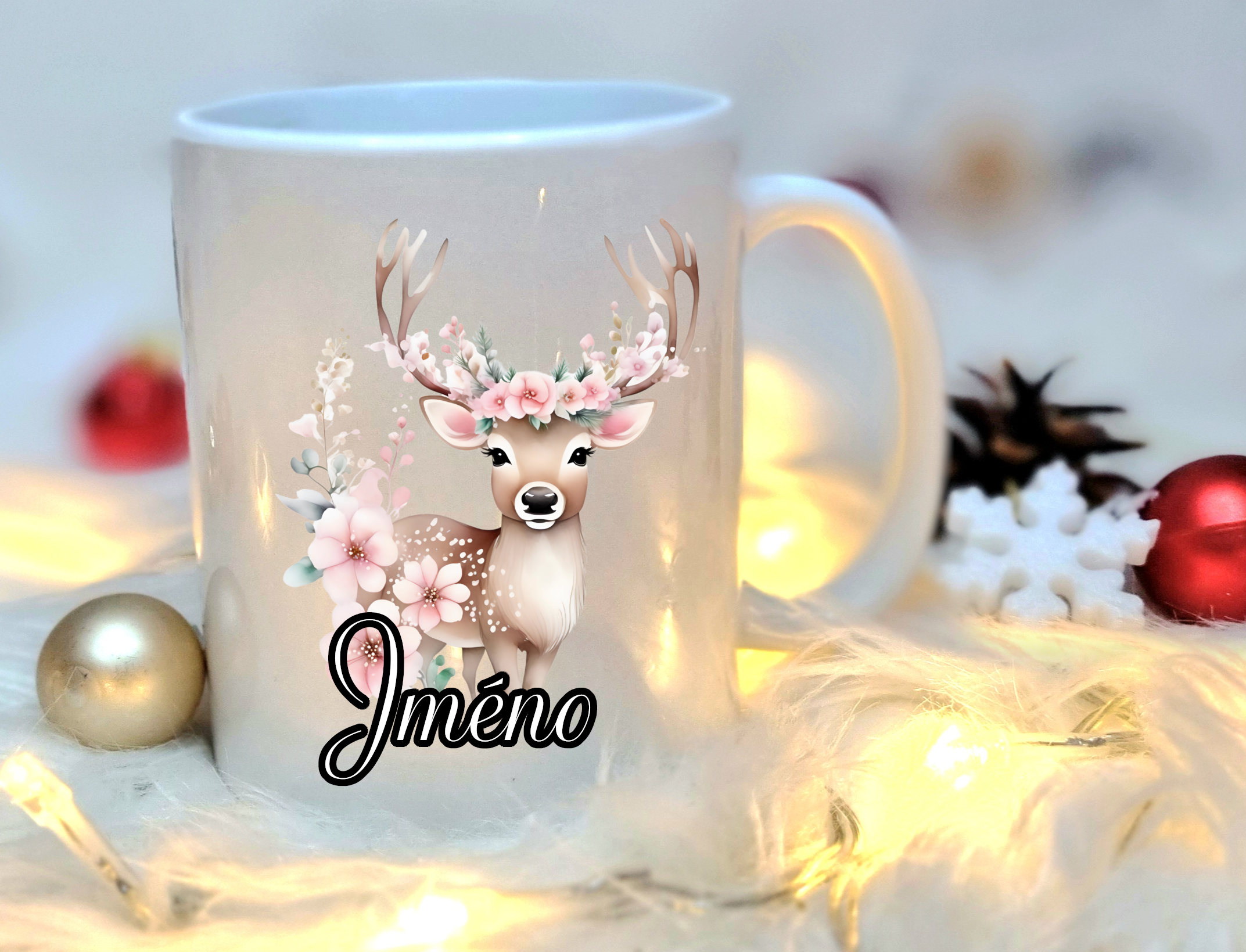 Vánoční hrneček s obrázkem sobíka Na hrneček se dá napsat jakékoliv jméno, podle vašeho přání (prosím pište do poznámky v prvním kroku v košíku.   Objem hrnečku 330 ml vhodné pro mytí v myčce   celý popis