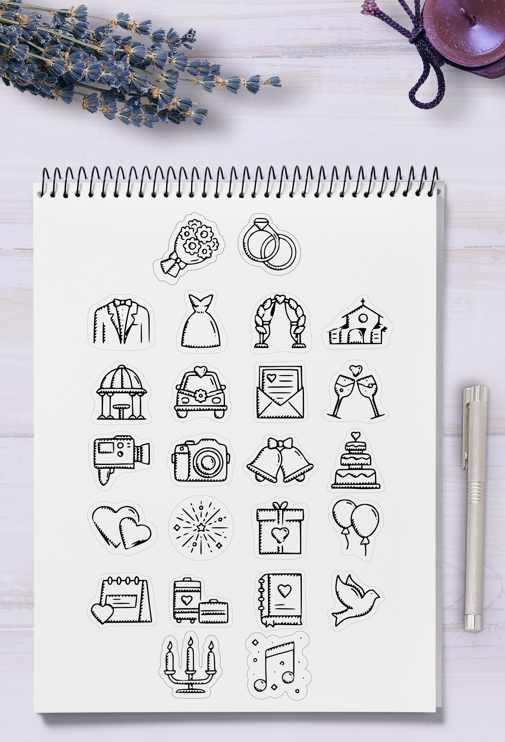 Svatební samolepky do svatební knihy se svatebními ikonami