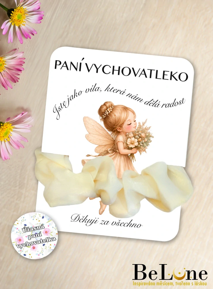 Součástí je kvalitní gumička v jemné barvě, upevněná na autorské kartičce s ilustrací víly a textem poděkování. Celý dáreček působí něžně, čistě a je ideální jako malá pozornost na konec školního roku, do školky nebo jen tak pro radost.